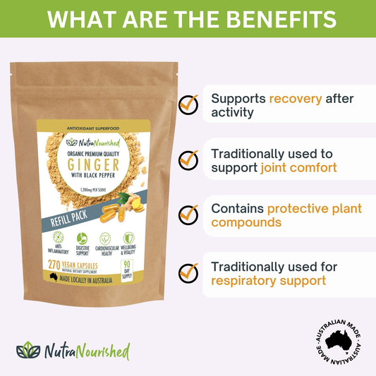 Ginger Powder Capsules Buffered with Black Pepper - Refill Bag - 270 Vegan CapsulesRegular price $83.90 AUDRegular priceUnit price per$119.90 AUDSale price $83.90 AUDSave $36.00 Sale
